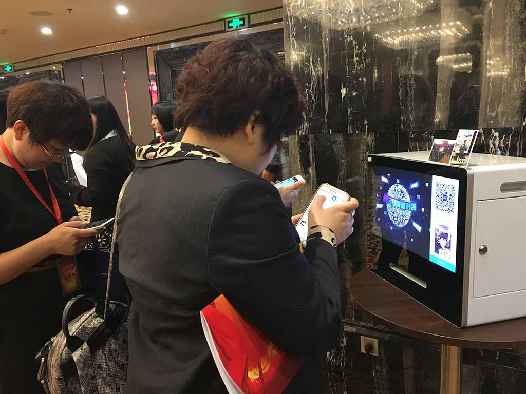 4月16日,快乐大屏幕受邀参加中国太平人寿年度高峰论坛会议活动。本次会议的互动环节选择了快乐大屏幕的滚动抽奖、标星消息、图片库、微信打印机等功能。微信打印机是一款即时打印照片的设备,来宾通过扫描二维码--上传照片--输入打印码,等待30S后即可取出自己的美照啦!在签到处摆上一台微信打印机,来宾在入场和退场时就可到此处打印照片作为留念,特别受女来宾的青睐哦!