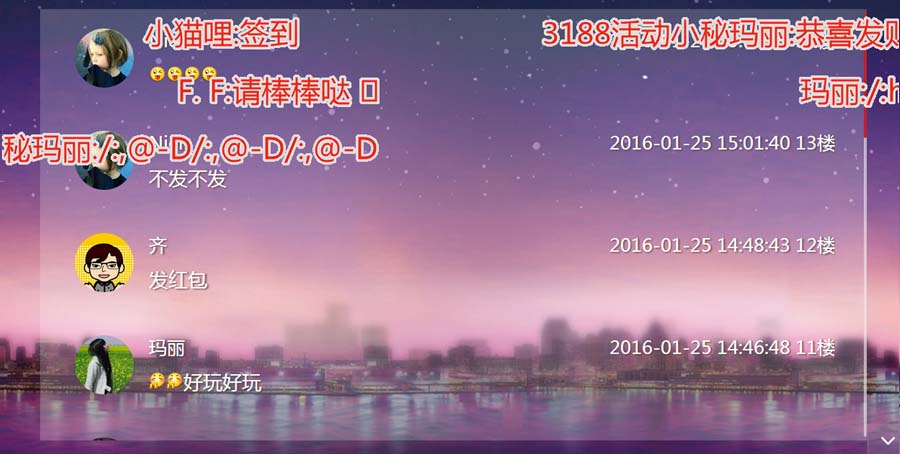 签到来宾发送文字、表情、图片等信息,这些信息将以弹幕的形式飞过大屏幕!让整个活动的交流、评论、吐槽、分享、提问变得更加有趣、时尚、好玩,提升活动档次。